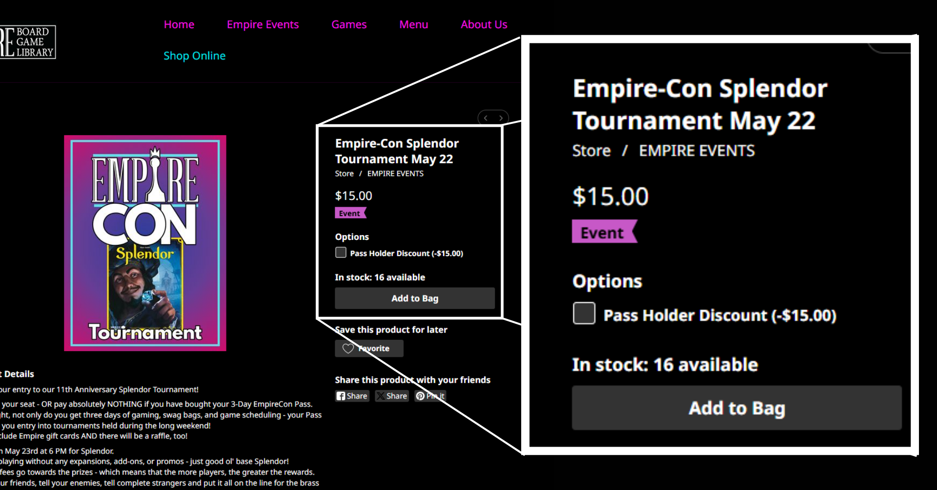 $15 buys your seat - OR free if you have bought your 3-Day EmpireCon Pass. That's right, not only do you get three days of gaming, private parking, swag bags, and Tabletop Events access - your Pass also nets you a sweet discount on tournaments held during the event!